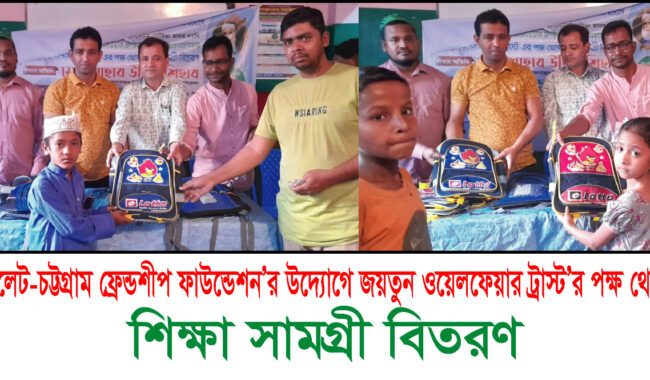আজ সিলেট-চট্টগ্রাম ফ্রেন্ডশীপ ফাউন্ডেশন এর উদ্যোগে জয়তুন ওয়েলফেয়ার ট্রাস্ট সিলেটে দক্ষিণ সুরমা উপজেলার মোগলাবাজার ইউনিয়নের বিভিন্ন স্কুল, মাদ্রাসার ৬০ জন মেধাবী ও গরীব শিক্ষার্থীদের মাঝে শিক্ষা সামগ্রী স্কুল ব্যাগ, খাতা, কলম ও স্কেল বিতরণ করা হয়।