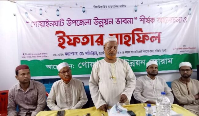 নিউজ ডেস্ক :: গোয়াইনঘাট উন্নয়ন ফোরাম অায়োজিত “গোয়াইনঘাট উপজেলা উন্নয়ন ভাবনা”শীর্ষক আলোচনা ও ইফতার মাহফিলে বক্তারা অবিলম্বে পিয়াইন নদী খনন এবং গোয়াইনঘাট কে পর্যটন উপজেলা ঘোষণার দাবী জানিয়েছেন। অাজ ২০ এপ্রিল সিলেট নগরীর ফোর স্টার অাইটি এন্ড নেটওয়ার্ক মিলনায়তনে গোয়াইনঘাট উন্নয়ন ফোরামের চেয়ারম্যান সাংবাদিক অানোয়ার হোসাইনের সভাপতিত্বে সাংবাদিক আমির উদ্দিন এর পরিচালনায় অনুষ্ঠিত সভায় বক্তাগণ এই দাবী জানান। সভায় বক্তারা অারো বলেন, গোয়াইনঘাট পৌরসভা ঘোষণা, সালুটিকর থানা প্রতিষ্ঠা, গ্যাস লাইন সংযোগ, ফায়ার সার্ভিস ষ্টেশন স্থাপন, কৃষি সম্প্রসারণ, উপজেলার জলমহাল গুলোর উন্নয়ন, সালুটিকর-গোয়াইনঘাট- সারিঘাট রোডের অবিলম্বে বর্ধিত ও মেরামত করণ, গাংকিনারী রাস্তার কাজ দ্রতকরণ, সালুটিকর বাজার বাইপাস রোড নির্মান অতীব গুরুত্বপূর্ণ। এক্ষেত্রে সংশ্লিষ্ট সকল কে এগিয়ে অাসতে হবে।