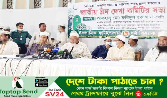 রোববার (১ মে) সন্ধ্যা ৭টা ৪৫ মিনিটে বায়তুল মোকাররম মসজিদে ইসলামিক ফাউন্ডেশনের সভাকক্ষে জাতীয় চাঁদ দেখা কমিটির বৈঠক শেষে এ সিদ্ধান্ত জানান ধর্ম প্রতিমন্ত্রী ও জাতীয় চাঁদ দেখা কমিটির সভাপতি মো. ফরিদুল হক খান।