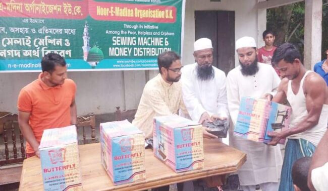 নূর এ মদীনা অর্গানাইজেশন ইউ.কের উদ্যোগে সেলাই মেশিন ও নগদ অর্থ বিতরণ করা হয়েছে। সংস্থার ভাইস প্রেসিডেন্ট মৌলভী নজমুল ইসলামের সভাপতিত্বে ও জয়েন্ট সেক্রেটারী মাওলানা রফিকুল ইসলাম জাকারিয়ার পরিচালনায় ৩০ এপ্রিল শনিবার বিশ্বনাথের শেখের গাও পুরাতন জামে মসজিদ প্রাঙ্গনে আয়োজিত অনুষ্ঠানে প্রধান অতিথির বক্তব্য রাখেন জামেয়া মোহাম্মদিয়া বিশ্বনাথের প্রিন্সিপাল মাওলানা নূরুল হক। প্রধান আলোচকের বক্তব্য রাখেন সিলেট লেখক ফোরাম সভাপতি সাংবাদিক কবি নাজমুল ইসলাম মকবুল।