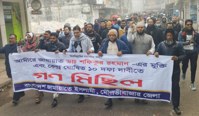 মৌলভীবাজার জেলা সংবাদদাতা: শনিবার সকালে মৌলভীবাজার শহরে গণমিছিল করেছে জামায়াত। জামায়াত আমীর ডা. শফিকুর রহমানের মুক্তি ও ঘোষিত ১০ দফা কর্মসূচী বাস্তবায়নের দাবীতে দলের দেশব্যাপী কেন্দ্রীয় কর্মসূচীর অংশ হিসেবে এ মিছিলের আয়োজন করে মৌলভীবাজার জেলা জামায়াত।শহরের গুরুত্বপূর্ণ সড়ক প্রদক্ষিণ করে জেলা জামায়াতের আমীর শাহেদ আলীর সভাপতিত্বে মিছিল পরবর্তী এক সমাবেশ অনুষ্ঠিত হয়। এসময় আরো বক্তব্য রাখেন জেলা জামায়াতের অন্যতম নেতা ইয়ামীর আলী।