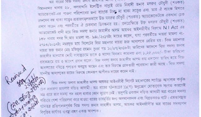 নিউজ ডেস্ক :: সিলেট জেলা কর আইনজীবী সমিতির এক সদস্যের বিরুদ্বে চেক জালিয়াতি ও প্রতারণার অভিযোগে দন্ডপ্রাপ্ত জাহাঙ্গীর আলম এর বিরুদ্ধে গত ২৯ মে এডভোকেট সোহেল আহমদ বাদী হয়ে জেলা কর আইনজীবী সমিতির সভাপতি/সাধারণ সম্পাদক বরাবরে লিখিত অভিযোগ দায়ের করেন।