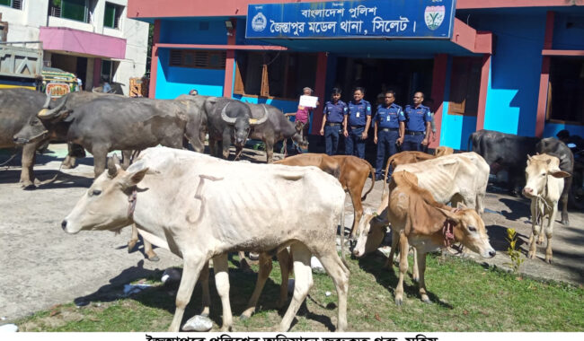 সিলেটের জৈন্তাপুর উপজেলার নিজপাট ইউনিয়নের বিভিন্ন স্থানে পুলিশ অভিযান চালিয়ে সীমান্ত থাকে আসা ভারতীয় অবৈধ চোরাই গরু, মহিষ ও চিনি জব্দ করা হয়। এই ঘটনার সাথে জড়িত ৪ জন চোরাকারবারিকে আটক করেছে জৈন্তাপুর মডেল থানা পুলিশ।