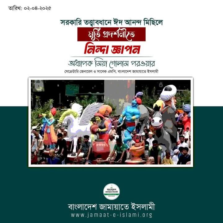 আলোকিত সিলেট ডেস্ক : সরকারি তত্ত্বাবধানে ঈদ আনন্দ মিছিলে মূর্তি প্রদর্শনীতে নিন্দা জানিয়ে বাংলাদেশ জামায়াতে ইসলামীর সেক্রেটারি জেনারেল ও সাবেক বিস্তারিত...