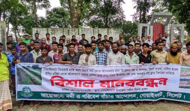 স্টাফ রিপোর্টার: সিলেটের গোয়াইনঘাট উপজেলায় তিতারাই হাজি কালা মিয়ার ঘাট থেকে অবৈধভাবে চাঁদা উত্তোলন বন্ধ এবং জাফলং, বাংলা বাজার, বালির হাওর, বুদির গাও ইসিএ (ইকোলজিক্যাল ক্রিটিক্যাল এরিয়া) থেকে ডেজার মেশিন দিয়ে অবৈধভাবে বালু ও পাথর উত্তোলন বন্ধের দাবিতে এক বিশাল মানববন্ধন অনুষ্ঠিত হয়েছে। শনিবার (১৪-০৬-২০২৫) বিকেলে গোয়াইনঘাট উপজেলার শহীদ মিনার প্রাঙ্গনে নদী ও পরিবেশ বাঁচাও আন্দোলন গোয়াইনঘাট শাখার উদ্যোগে এই কর্মসূচি পালিত হয়।