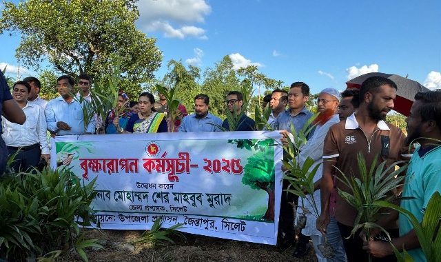 সিলেটের জৈন্তাপুর উপজেলায় বৃক্ষরোপন অভিযান-২০২৫ এর উদ্বোধন করেছেন সিলেটের জেলা প্রশাসক মোহাম্মদ শের মাহবুব মুরাদ। মঙ্গলবার (২৯শে জুলাই) বিকেল ৪:০০ ঘটিকায় জৈন্তাপুর উপজেলার ডিবিরহাওড় লালশাপলা বিল এলাকা সংলগ্ন ডিবিরহাওড় মৌজার খাস জমিতে সুপারী গাছের চারা রোপনের মধ্য দিয়ে এই কর্মসূচির সূচনা করা হয়। উপজেলা প্রশাসনের আয়োজনে উক্ত মৌজায় ১৩ দশমিক ৬৯ একর খাস জমিতে মোট দশ হাজার সুপারি গাছের চারা রোপন করা হবে।