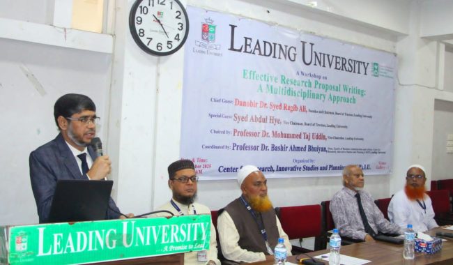 লিডিং ইউনিভার্সিটির সেন্টার ফর রিসার্চ ইনোভেটিভ স্টাডিজ এন্ড প্লানিং এর উদ্যোগে গবেষণা বিষয়ক কর্মশালা অনুষ্ঠিত হয়েছে। বৃহস্পতিবার (১১ সেপ্টেম্বর ২০২৫) সকাল ১০টায় বিশ্ববিদ্যালয়ের রাগীব আলী ভবনের গ্যালারী-১ এ “Effective Research Proposal Writing: A Multi Disciplinary Approach” শীর্ষক কর্মশালায় গবেষণামুখী শিক্ষাব্যবস্থার প্রবর্তন খুবই জরুরী উল্লেখ করে লিডিং ইউনিভার্সিটির উপাচার্য প্রফেসর ড. মোহাম্মদ তাজ উদ্দিন বলেন,