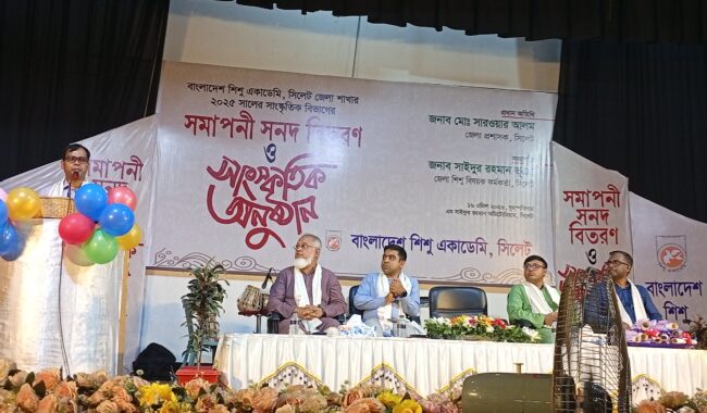মাহফুজ কাউসার ছাদি : বাংলাদেশ শিশু একাডেমি, সিলেট জেলা শাখার আয়োজনে ২০২৫ সালের সাংস্কৃতিক বিভাগের সমাপনী সনদ বিতরণ ও সাংস্কৃতিক অনুষ্ঠান বৃহস্পতিবার (১৬ এপ্রিল ২০২৬) নগরীর রিকাবীবাজারস্থ এম সাইফুর রহমান অডিটোরিয়ামে অনুষ্ঠিত হয়। অনুষ্ঠানে প্রধান অতিথি হিসেবে উপস্থিত ছিলেন সিলেটের জেলা প্রশাসক মোঃ সারওয়ার আলম। বিশেষ অতিথি হিসেবে বক্তব্য রাখেন অতিরিক্ত জেলা প্রশাসক (শিক্ষা ও আইসিটি) মাসুদ রানা, অতিরিক্ত পুলিশ সুপার (প্রশাসন ও অর্থ) মোঃ রাসেলুর রহমান,কবি ও বাচিক শিল্পী সালেহ আহমদ খসরু। অনুষ্ঠানের সভাপতিত্ব করেন জেলা শিশু বিষয়ক কর্মকর্তা সাইদুর রহমান ভূঞা। অনুষ্ঠান পরিচালনা করেন বাচিক শিল্পী নাজমা পারভীন।এছাড়া অনুষ্ঠানে আরও উপস্থিত ছিলেন সিলেট অনলাইন প্রেসক্লাবের সভাপতি গোলজার আহমদ হেলাল এবং গণপূর্ত অধিদপ্তর, সিলেটের নির্বাহী প্রকৌশলী মো আবু জাফর।