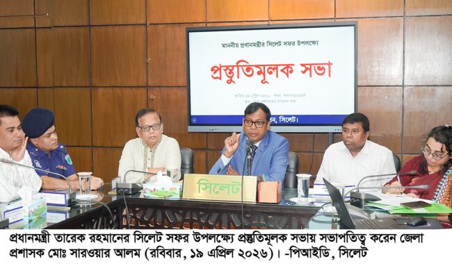 সভাপতির বক্তব্যে জেলা প্রশাসক জানান, আগামী ০২ মে প্রধানমন্ত্রী তারেক রহমান সিলেট সফর করবেন। সফরের অংশ হিসেবে তিনি শহীদ জিয়ার স্মৃতিবিজড়িত বাসিয়া নদীর পুনঃখনন কার্যক্রমের উদ্বোধন করবেন, যা পূর্বে শহীদ প্রেসিডেন্ট জিয়াউর রহমান শুরু করেছিলেন। এছাড়া তিনি সিলেট জেলা স্টেডিয়ামে ‘নতুন কুঁড়ি স্পোর্টস” এবং সিলেট মেডিকেল বিশ্ববিদ্যালয়ের উদ্বোধন করবেন।