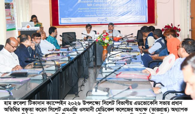 সিলেটে হাম ও রুবেলার টিকাদান ক্যাম্পেইন-২০২৬ সফল করার লক্ষ্যে বিভাগীয় পর্যায়ে অ্যাডভোকেসি সভা অনুষ্ঠিত হয়েছে। আজ (রবিবার) বিভাগীয় পরিচালক (স্বাস্থ্য) এর কার্যালয়ের কনফারেন্স রুমে আয়োজিত সভায় প্রধান অতিথি হিসেবে উপস্থিত ছিলেন সিলেট এম এ জি ওসমানী মেডিকেল কলেজের অধ্যক্ষ অধ্যাপক ডা. মো. জিয়াউর রহমান চৌধুরী।